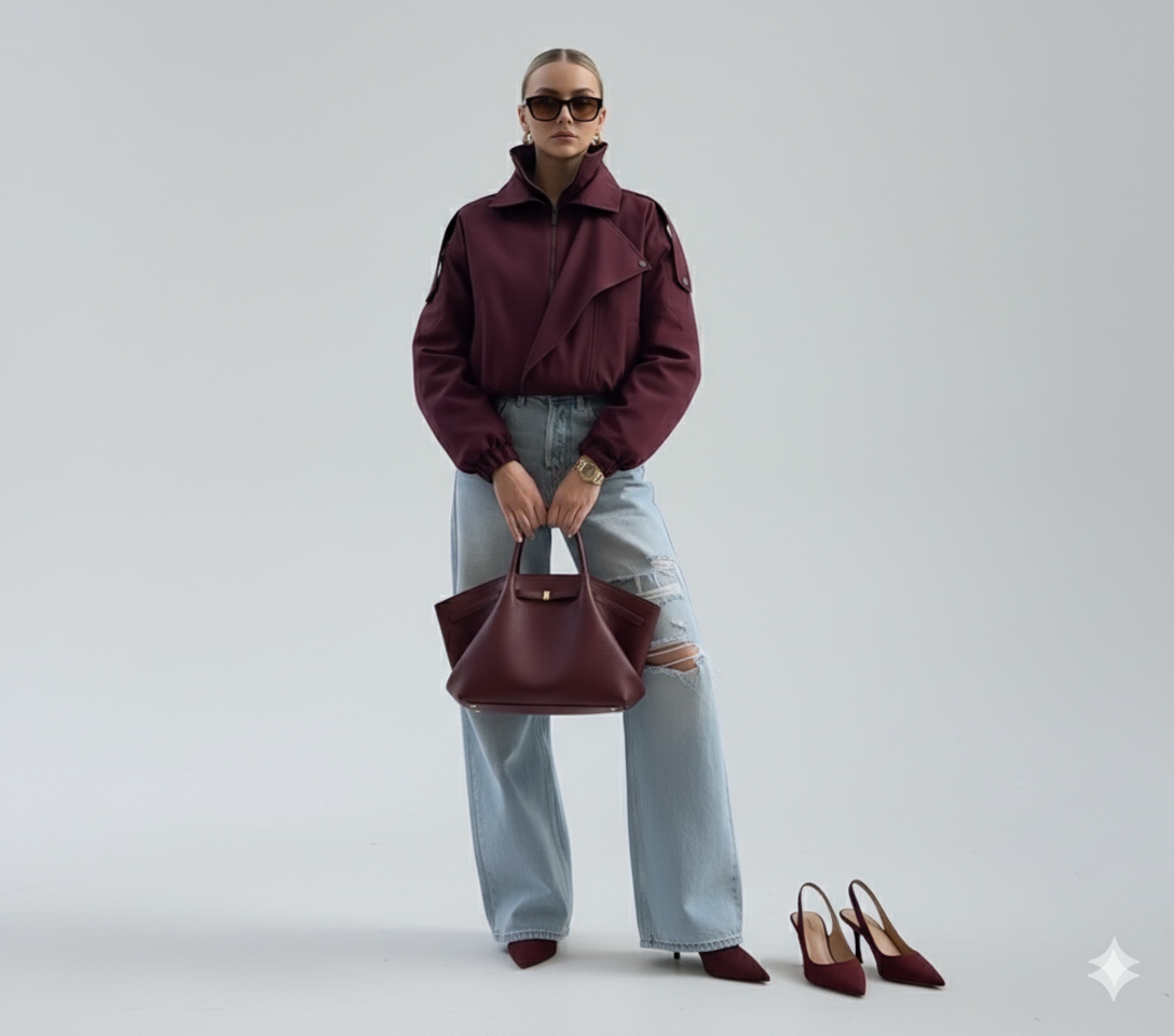 Turn everyday moments into a statement with this deep wine bomber jacket paired with relaxed light-wash denim. Minimal, modern, and bold — the perfect blend of confidence and comfort.